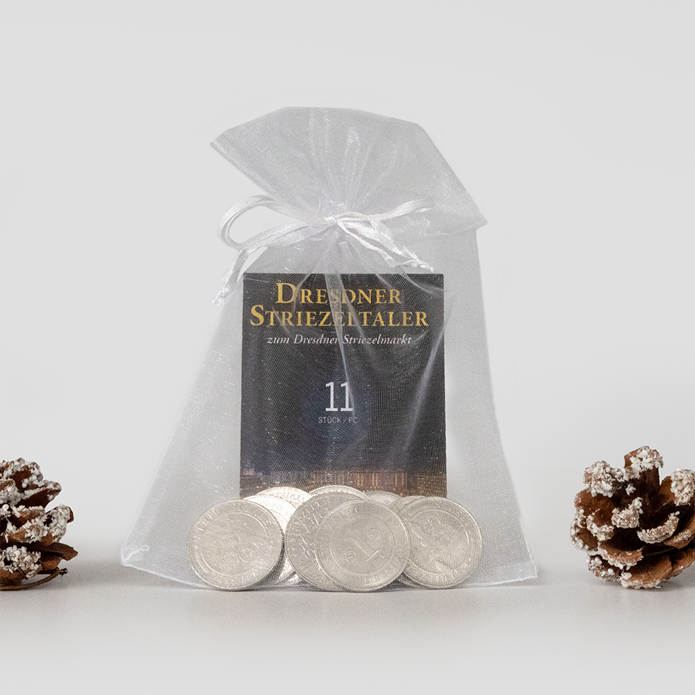 Jedes Talersäckchen enthält 11 Striezeltaler mit gemischten Motiven vergangener Jahrgänge (unsortiert). Alle Münzen werden in einem cremefarbenen Organza-Säckchen geliefert.